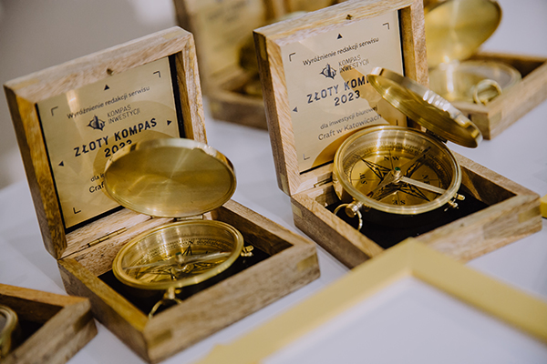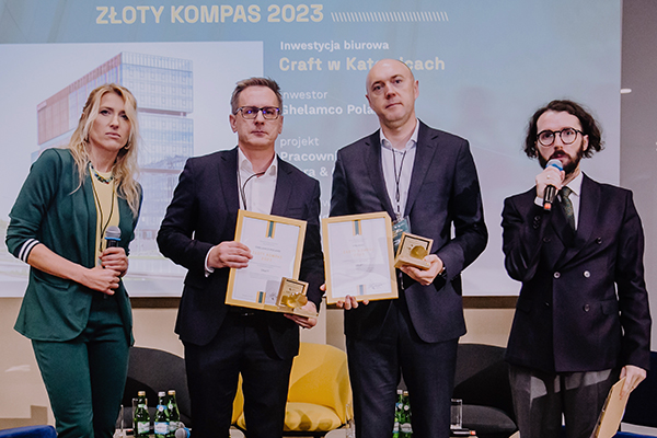 Symboliczne Złote Kompasy wręczyła Maja Bromowska, Prezeska Kompasu Inwestycji, podczas V edycji konferencji Forum Ekspertów. Wyróżnienia - kierowane do inwestora, projektanta i wykonawcy - przyznawane są inwestycjom realizowanym w duchu zrównoważonego budownictwa. Jak podkreślił Michał Oksiński, redaktor serwisu Kompas Inwestycji, katowicki biurowiec Craft poza ekologicznymi rozwiązaniami, przestrzenią przyjazną dla użytkowników to również ciekawa architektura wpisana w kontekst miejsca. Statuetki odebrali osobiście: Rafał Gierczak, Członek Zarządu Ghelamco oraz Przemysław Kuliś, Dyrektor Finansowy Dyrekcji Strabag - firmy będącej generalnym wykonawcą inwestycji.