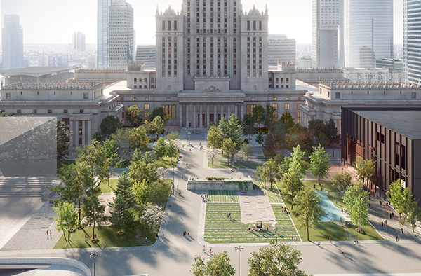 Nowe zagospodarowanie przestrzeni między Muzeum Sztuki Nowoczesnej a Pałacem Kultury i Nauki przygotowała pracownia A-A Collective. Koncepcja tego zespołu znalazła się wśród pięciu najlepszych propozycji wyłonionych w międzynarodowym konkursie. Komisja przy Biurze Architektury i Planowania Przestrzennego wybrała zwycięski zespół. Autorzy z A-A Collective z Zygmuntem Borawskim na czele zaprojektowali przestrzeń, która połączy centralną część placu Defilad z parkiem w rejonie ul. Świętokrzyskiej.Nieregularny układ chodników i zieleni odwzoruje sieć dawnych ulic i zarys budynków. Trawniki mają przypominać miejsca, w których stały kamienice.Pozostałości po starych budynkach zostały wyburzone po II wojnie światowej, by zrobić miejsce pod Pałac Kultury i Nauki.