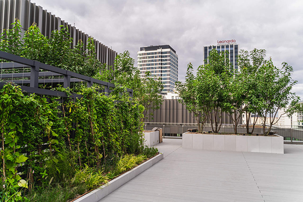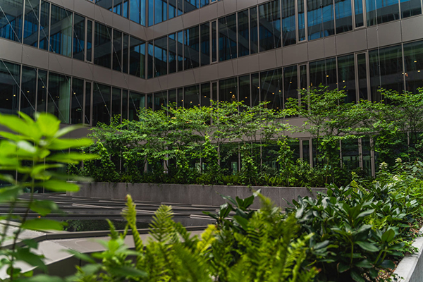 Ściany budynków biurowych, patia, atakże wejścia dokompleksu zdobić będą również pnącza – m.in. bluszcz pospolity, winorośl japońska czy słynący zcharakterystycznych, dekoracyjnych liści wkształcie serca - kokornak wielkolistny. Zasadzone zostały wspecjalnych donicach umieszczonych wziemi ipnąć się będą po systemie specjalnych mocowań idedykowanego dotego typu rozwiązań linek metalowych.