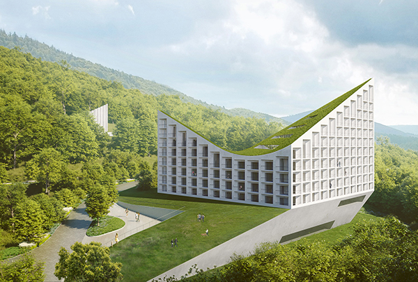 Planowane są m.in. trzy nowe budynki w kształcie nawiązującym do dawnych piramid. Z daleka mają wyglądać prawie identycznie jak te powojenne, dopiero z bliska będzie można odkryć ich współczesne pochodzenie. – Pierwotne domy wczasowe mają doklejone balkony, my traktujemy piramidy jak skalne masywy, w których drążymy. W ten sposób we wgłębieniach powstaną obszerne loggie, dzięki czemu duże przeszklenia budynków zyskają potrzebne zacienienie i nie będą się przegrzewać latem. Z kolei od dołu zamierzamy mocno podciąć kubatury, aby zminimalizować ingerencję obiektów w zbocze – tłumaczy Konieczny. Każda z nowych piramid będzie mieć podobny układ dwóch wierzchołków różnej wysokości, jednak pomiędzy nimi powstanie nowatorski, siodłowy dach pokryty trawą. Organiczna forma zadaszenia ma być znakiem współczesnych możliwości technologicznych, ale i nacisku na zrównoważone budownictwo.