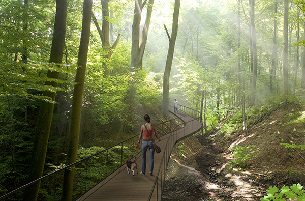 Sercem całego założenia będzie nowy deptak, biegnący wzdłuż obecnej głównej drogi, przecinającej dzielnicę z północny na południe. – W okresie budowy Zawodzia dominowało inne myślenie o komunikacji, w tamtych czasach faworyzowano ruch kołowy. Chcemy tę przestrzeń przekształcić – dodać deptak, ścieżkę rowerową, szerokie i bezpieczne przejścia, których tam dziś brakuje. Teren stanie się bardziej atrakcyjny dla spacerowiczów, bo wzdłuż deptaku rozlokowane będą funkcje ogólnodostępne, jak stacja kolejki linowej, pijalnia wód, knajpki – wyjaśnia Franta. Droga, wraz przestrzenią dla pieszych i rowerzystów, stanie się rodzajem górskiego deptaku, z którego będzie można podziwiać widoki na masyw Beskidu Śląskiego, w tym Wielką Czantorię. Zapowiada się zatem bliźniak bulwaru, który biegnie w dole – tuż nad Wisłą.