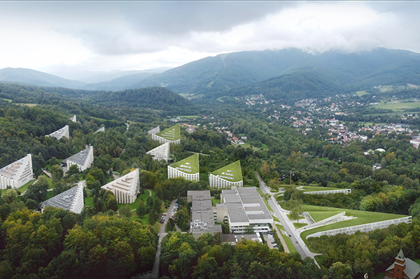 Punktem wyjścia dla nowej koncepcji rozbudowy uzdrowiska była analiza miejsca i jego potrzeb, ale również dawnych, oryginalnych planów. – Ustroń Zawodzie to jeden z najlepszych w Polsce przykładów wkomponowania nowoczesnej architektury w górski krajobraz. Piramidy wyglądają jak skały, swobodnie rozrzucone po lesistym stoku, ale po analizie rysunków naszych poprzedników, odkryliśmy, że to nie tylko przemyślana kompozycja, ale wręcz matematyczny wzór. Chcemy się w niego wpisać i twórczo kontynuować myśl tercetu Buszki, Franty i Szewczyka – tłumaczy Robert Konieczny. Kolejnym nawiązaniem do matematyki jest inne założenie projektu: dodatni bilans środowiskowy. Wyjątkowo cenne walory przyrodnicze Ustronia są w projekcie troskliwie chronione, a dostępna dla wszystkich zieleń na dachach budowli jest jednym z ważnych symboli tego projektu.