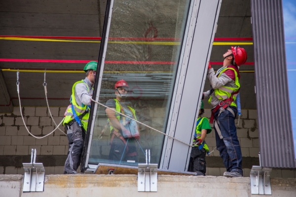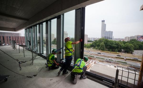 Od maja trwa montaż elewacji. Tworzą ją panele wykonane z selektywnego szkła i prefabrykowanego betonu, które okala metalowa rama. Pojedynczy fragment waży ok. 500 kg, dlatego przy ich instalacji konieczna jest pomoc maszyn. Transport paneli na górne kondygnacje odbywa się z wykorzystaniem żurawia wieżowego i zewnętrznej windy, zlokalizowanej po wschodniej stronie budynku. Precyzyjne ustawienie i przygotowanie fragmentów elewacji do montażu umożliwia specjalistyczny mini-żuraw, znajdujący się na kondygnacji ponad miejscem instalacji danego elementu. Jego praca zdecydowanie ułatwia robotnikom swobodne manewrowanie panelem i przytwierdzenie go we właściwym punkcie.