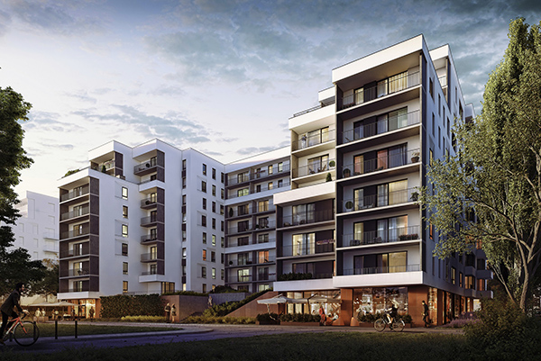W budynku powstanie 10 lokali usługowych oraz 131 mieszkań, w większości dwu- i trzypokojowe. Balkony i tarasy mają kaskadowo schodzić w stronię zielonej osi kompleksu – parku linearnego. W garażu podziemnym przewidziano 158 miejsc postojowych.