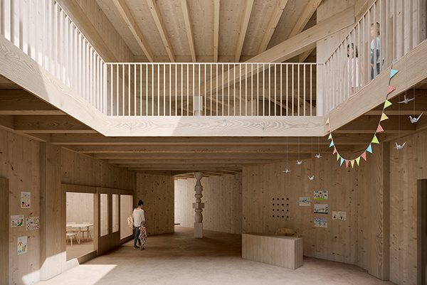 – Projektując przedszkole, staraliśmy się unikać standardowego myślenia o świecie dzieci. Każdy maluch ma swoją przebogatą wyobraźnię i rolą architektury jest stworzenie takiej przestrzeni, która umożliwi jej rozwój – wyjaśnia Edyta Filipczak z WXCA. I tak sale dydaktyczne na dole są połączone z ogrodem, dzięki czemu możliwe jest przedłużenie wnętrza na zewnątrz i tym samym powiększenie przestrzeni edukacyjnej i wprowadzenie do niej nowych bodźców. Architektom zależało również, aby przestrzeń wspólna nie była podłużnym korytarzem, służącym wyłącznie komunikacji, tylko żeby stanowiła jedność na obu kondygnacjach. Stąd jasny, dwukondygnacyjny hol i konstrukcyjna (oraz symboliczna) kolumna, porządkująca wszystkie funkcje budynku.