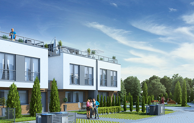 Zarówno w przypadku mieszkań, jak i domów, deweloper przewidział układ pomieszczeń z podziałem na strefę dzienną i nocną. Na parterze znajduje się pokój dzienny z otwartą kuchnią oraz toaleta, na piętrze – trzy pokoje oraz łazienka. Dodatkowo właściciele mieszkań będą mieć do dyspozycji poddasze nieużytkowe o powierzchni ok. 11 mkw. i taras na dachu, a właściciele domów – prywatny ogród.