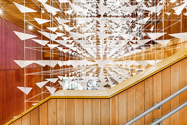 Pierwszoplanowa kinetyczna rzeźba okalająca budynek, ruch, gra światła, podmuchy powietrza i towarzyszący im szelest, stwarzają okazję do kontemplacji zjawisk przyrody, refleksji nad współistnieniem człowieka z naturą i przywodzą na myśl stado ptaków, żagle, łopoczące na wietrze liście, które symbolizują mobilność, integrację i zbiorową inteligencję. Sama budowa pawilonu świadczy o rozsądnym i optymalnym wykorzystaniu bardzo różnych zasobów. Dynamiczna bryła, składająca się z rozrastających się ku górze modułowych konstrukcji, tworzy otwartą przestrzeń i zachęca do zatrzymania się w cieniu rozległego zadaszenia. Dominującym materiałem wykończeniowym budynku jest drewno.