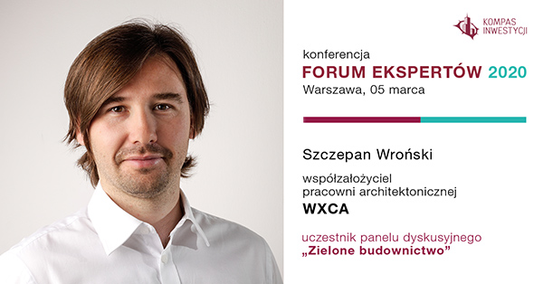 Szczepan Wroński, współzałożyciel pracowni architektonicznej WXCA weźmie udział w panelu dyskusyjnym "Zielone budownictwo" podczas konferencji Forum Ekspertów. Wydarzenie odbędzie się 5 marca 2020 r. w Warszawie.